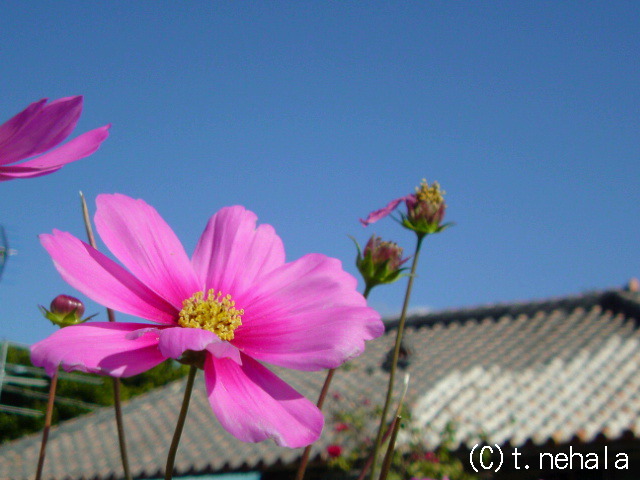 で、珍しいコスモスと瓦屋(?)の写真。