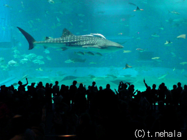 本当はジンベイザメが三匹そろったところを撮りたかったけど、人ごみの中、&人を待たしたまま同じ場所に長時間居すわるのはきつかったので、一匹で我慢。